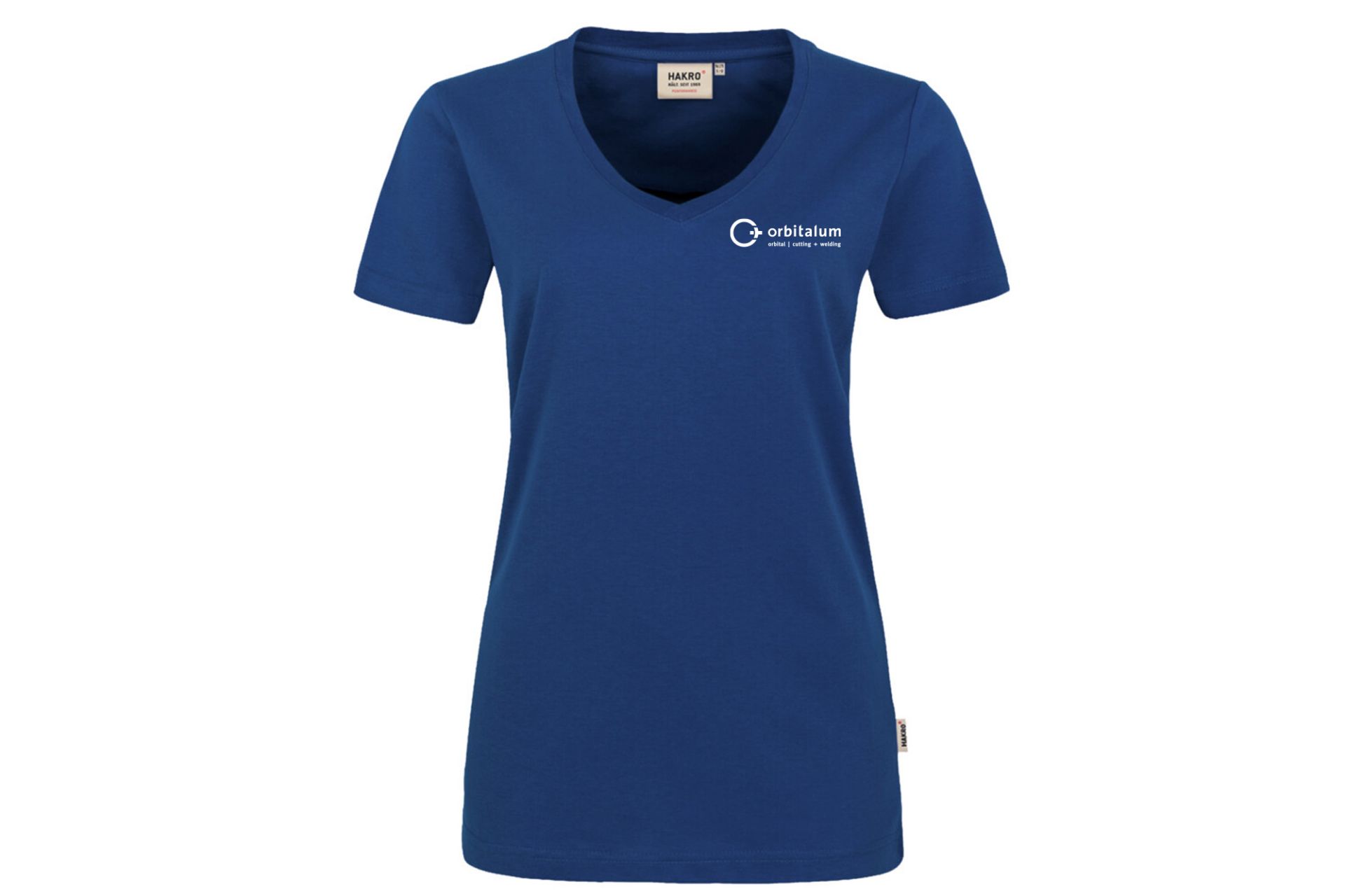 Extra-durable T-shirt for women with a feminine V-neck, ribbed neckcuff and neck tape. Rental label for easy identification in commercial laundry and hangers in the seam. Made of soft, easy-to-clean and functional medium-weight single jersey made of the HAKRO performance material mix MIKRALINAR®. Woven HAKRO neck label made of high-quality warp satin with soft, ultrasonic cut band edges for maximum wearing comfort and woven HAKRO flag label on the left side seam.